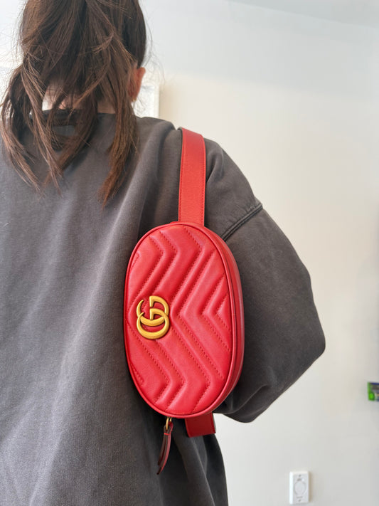 Gucci Marmont red/gold belt bag fits phones cardholders keys etc size 85 fits XS S and M in box !