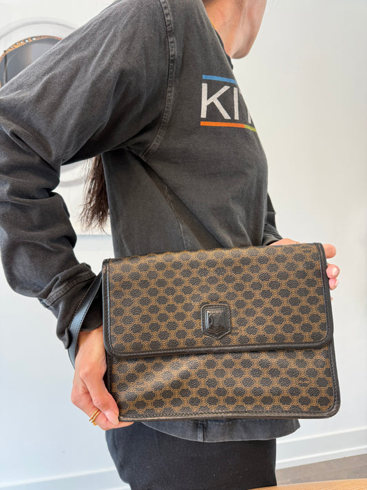 Celine black macadam triple compartment leather heavy duty wristlet with added removeable crossbody strap ! Fits phones wallets makeup etc