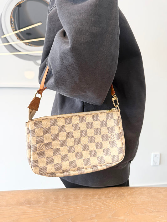 Louis Vuitton damier azur pochette accessories with 2 original straps , original box and strap dustbag! Gorgeous preloved condition