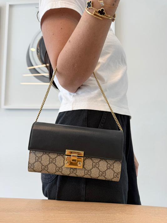 Gucci supreme padlock shoulder padlock bag in original box with original chain pristine condition plus a free aftermarket crossbody strap ! Fits phones cards cash coins etc