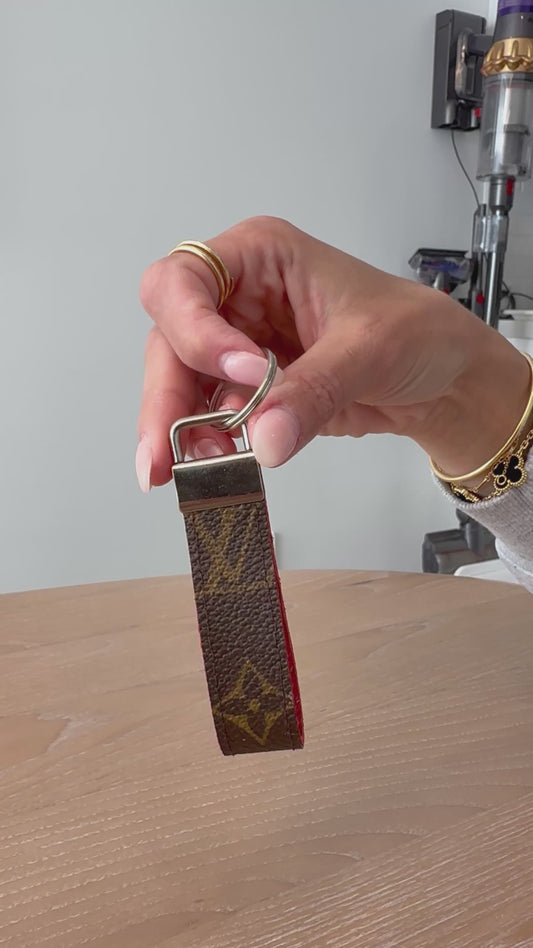 Upcycled lv keychain with silver hardware at made from an authentic keepall 60