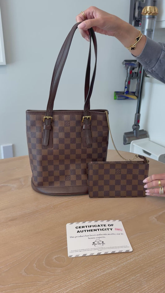 Louis vuitton Damier ebene bucket pochette shoulder bag set ! Gorgeous pre loved condition inside and out red suede interior!