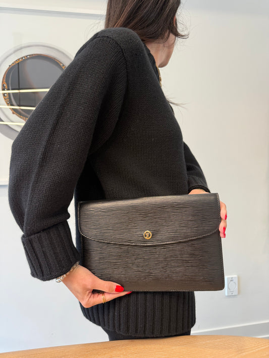 • Rare Louis Vuitton epi black / gold montaigne crossbody clutch in pristine condition fits phones wallets keys etc