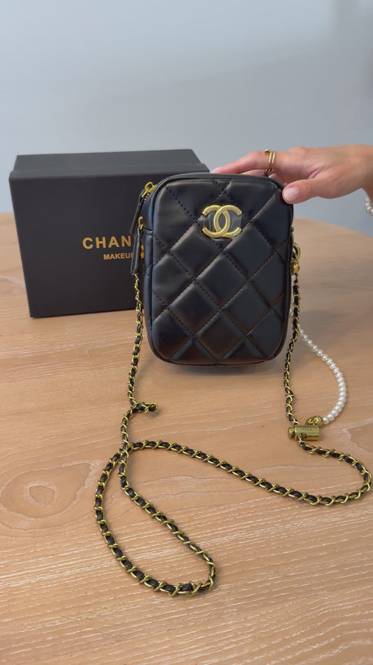 Brand new in box Chanel black/gold novelty wallet on a chain! Don’t spend $5000 in stores ! This novelty vip makeup bag fits phones keys makeup etc