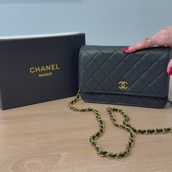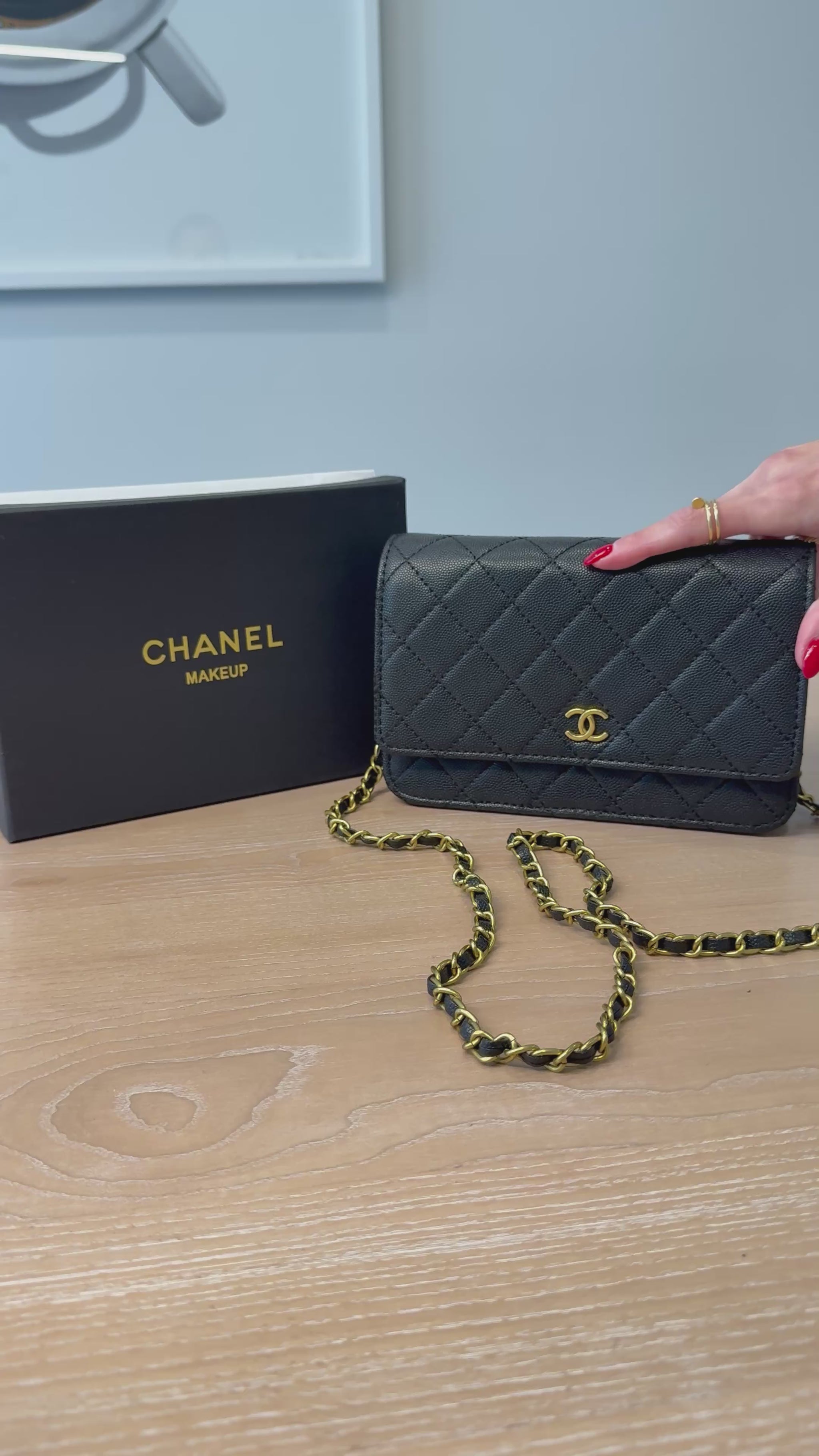 Brand new in box Chanel black/gold novelty wallet on a chain! Don’t spend $5000 in stores ! This novelty vip makeup bag fits phones keys makeup etc