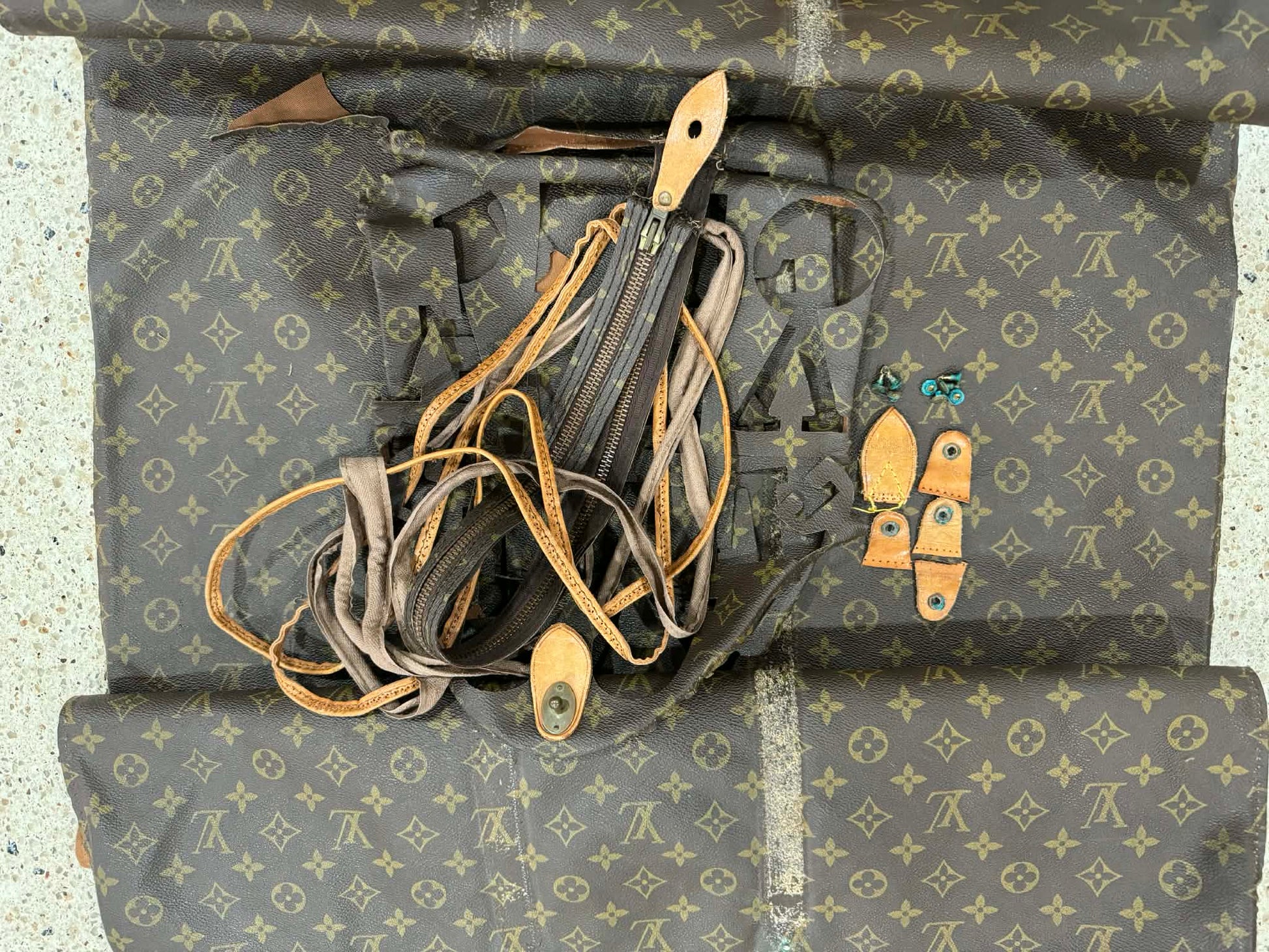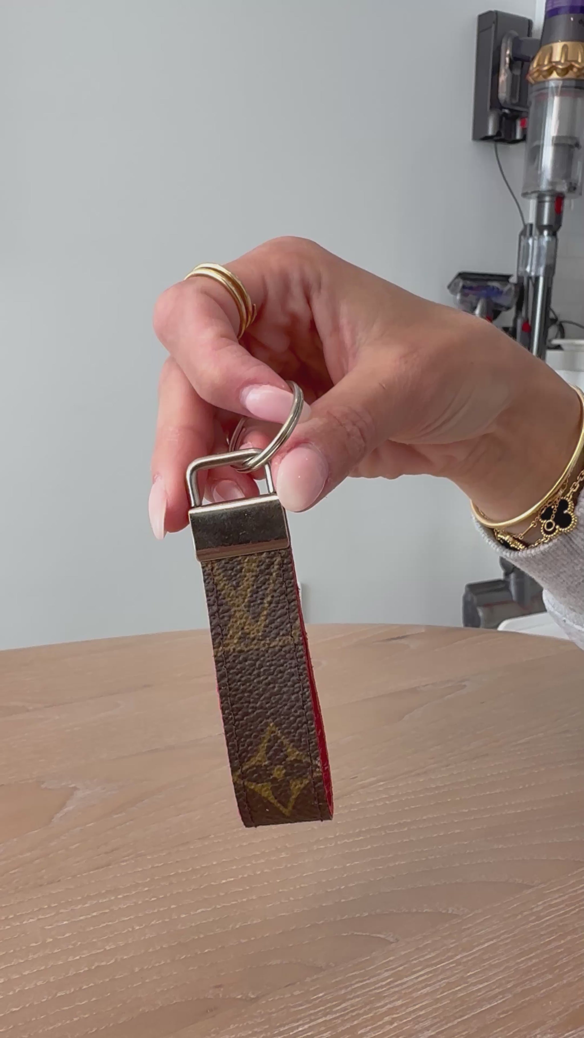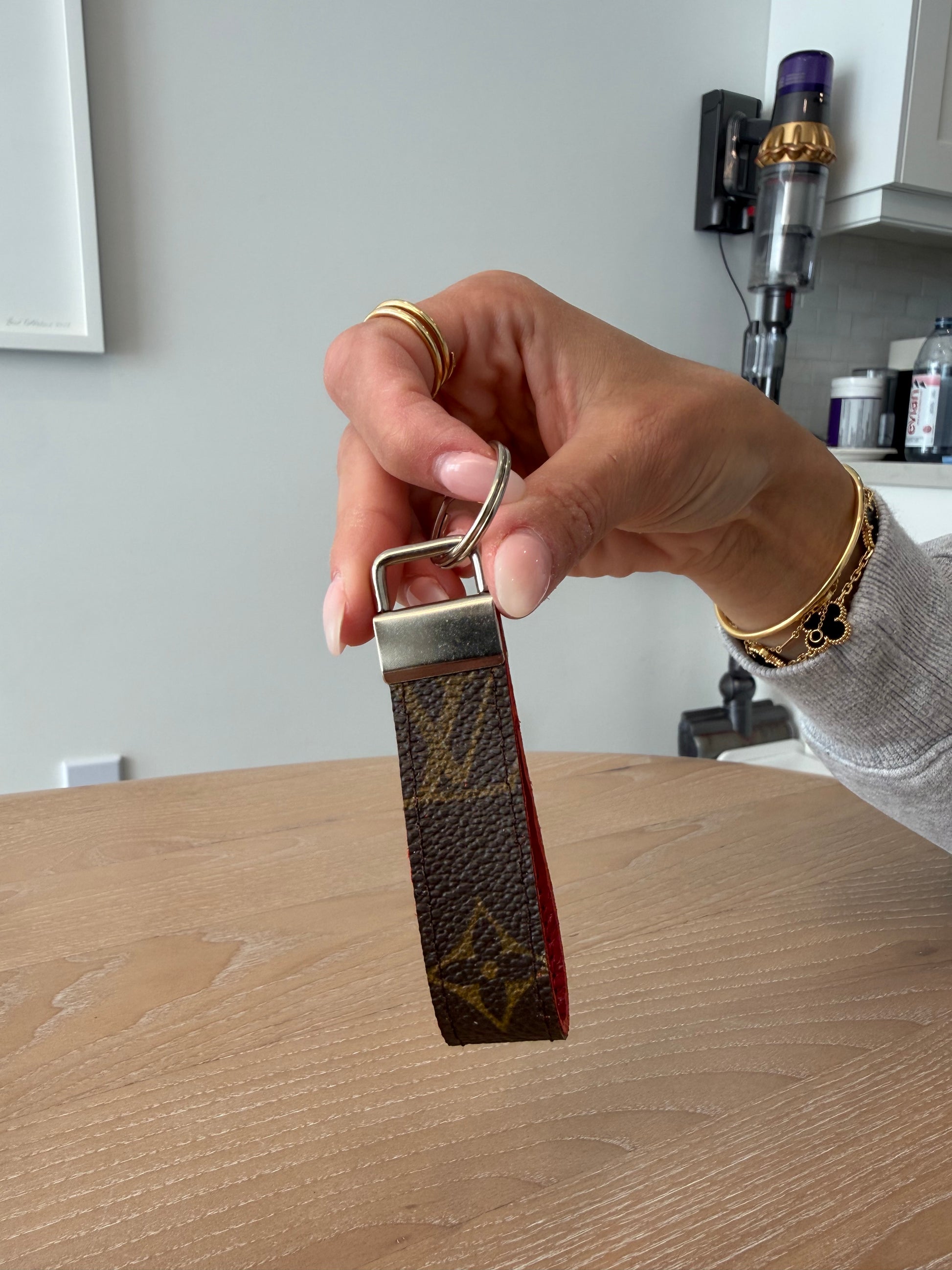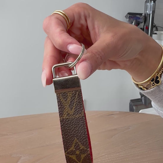 Upcycled lv keychain with silver hardware at made from an authentic keepall 60